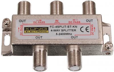 Tweevoudig verdeelelement in een metalen die-cast behuizing met DC-power pass en F-connector aansluitingen voor het verdelen van antenne signalen.