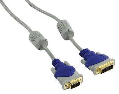 DVI-A 12+5pins male - VGA 15pins male monitorkabel met ferrietkernen. Deze kabel kan alleen analoge signalen doorgeven, bijvoorbeeld tussen een computer met een VGA aansluiting en een LCD monitor met DVI aansluiting.