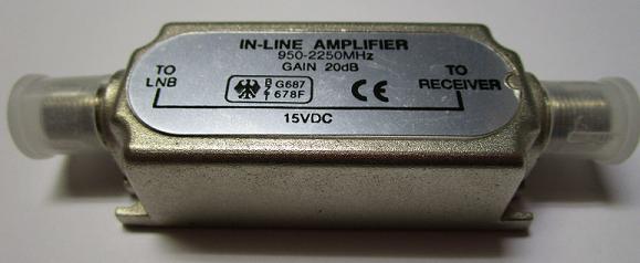 De in-line versterker verhoogt het signaal met 20B en wordt aangesloten tussen de LNB en de ontvanger. De LNB-spanning wordt gebruikt als voeding.