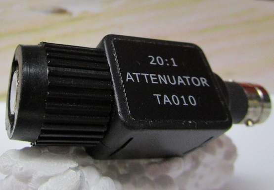 Deze geplaatst tussen de meetprobe en de oscilloscoop ingang, verzwakt het signaal een extra 20 keer.