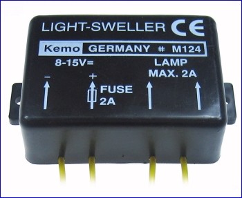 De Kemo M124 fluctuator regelt gloei- en halogeenlampen langzaam van donker naar licht en weer terug en dit in een zich steeds herhalende cyclus. De module werkt dus net als een knipperlicht, behalve dat de lampen niet abrupt knipperen, maar langzaam op volle sterkte komen en dan weer langzaam uitgaan.