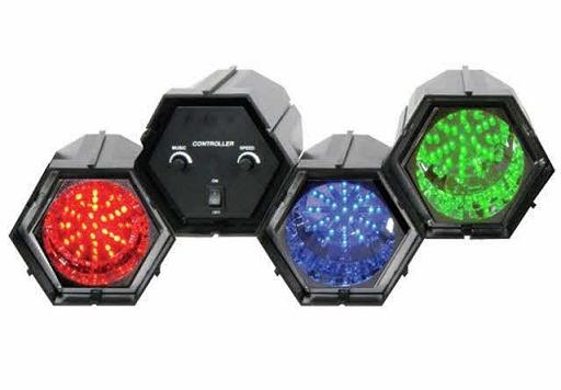 LED lichteffect met drie koppelbare LED-modules, samengesteld uit een controllermodule en drie lichtmodules met gekleurde LED's.