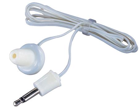 A discreet, white, mono magnetic earpiece with a 3.5mm mono jack plug and matching lead.