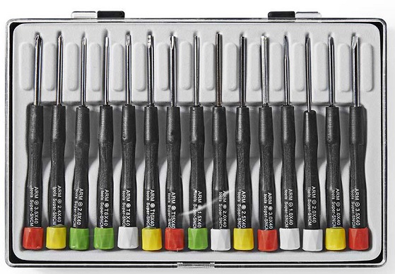 Set precisieschroevendraaiers, met de meest voorkomende schroefkoppen in verschillende maten.