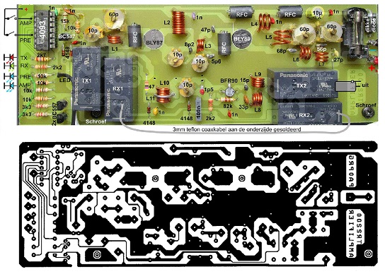 Geboorde print met schematekening en onderdelen opstelling van de 25watt zender eindversterker met ingebouwde pre-amp voorversterker voor de 2 meter amateurband.